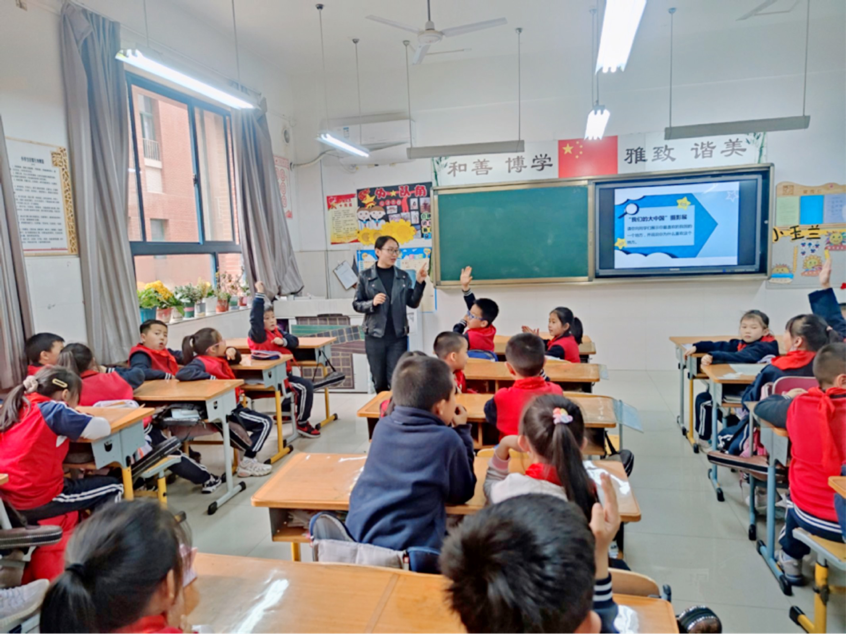 张依芳以《美丽中国是我的家》为题,通过播放歌曲《我爱你,中国》,让同学们寻找歌曲中赞美祖国的句子来抒发自己的爱国之情。